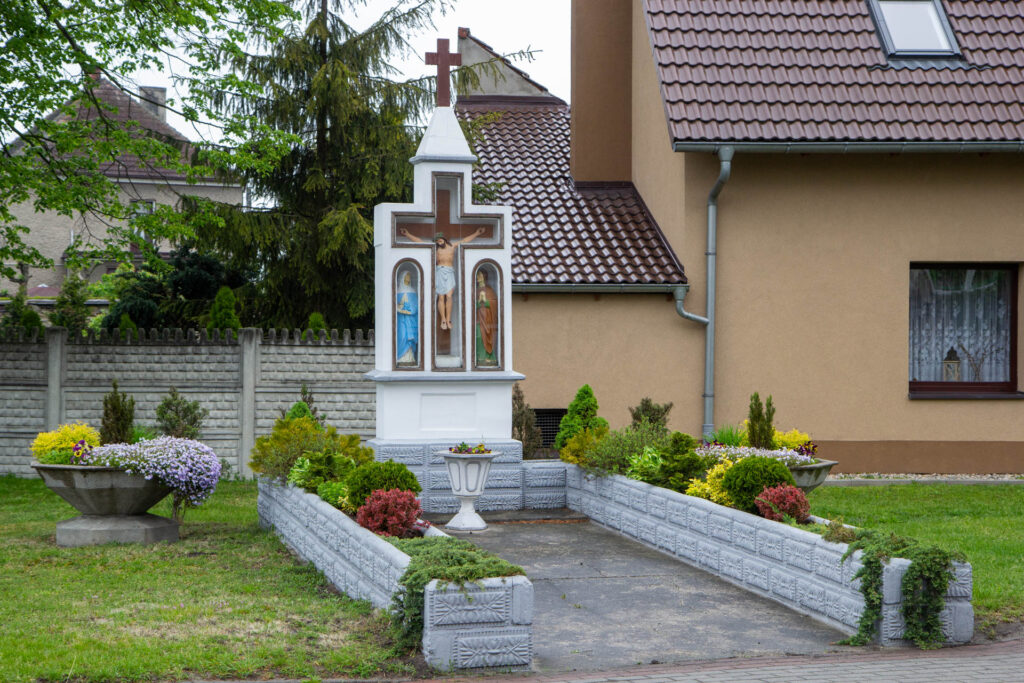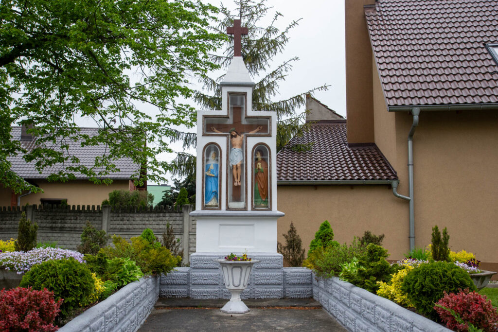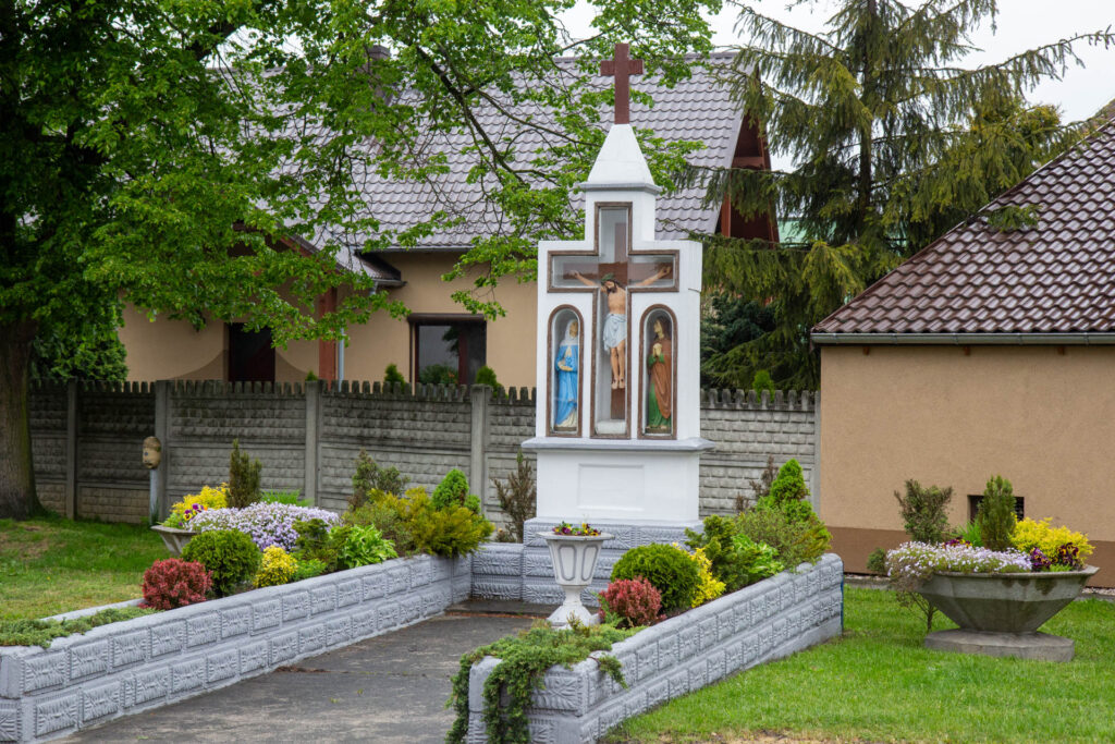 Naprzeciwko dzisiejszego gmachu Urzędu Gminy stoi krzyż – kaplica. Ufundował go i wykonał w 1895 r. miejscowy kamieniarz Lika stawiając go pierwotnie w swoim ogrodzie. Przeniesiono go w obecne miejsce po zakończeniu budowy urzędu. W jego centralnej części umieszczony jest wizerunek Jezusa ukrzyżowanego, a we wnękach znajdujących się pod ramionami krzyża dwie figurki świętych. Całość jest oszklona. Umiejscowione poniżej tej symbolicznej sceny miejsce na napis jest dzisiaj puste.