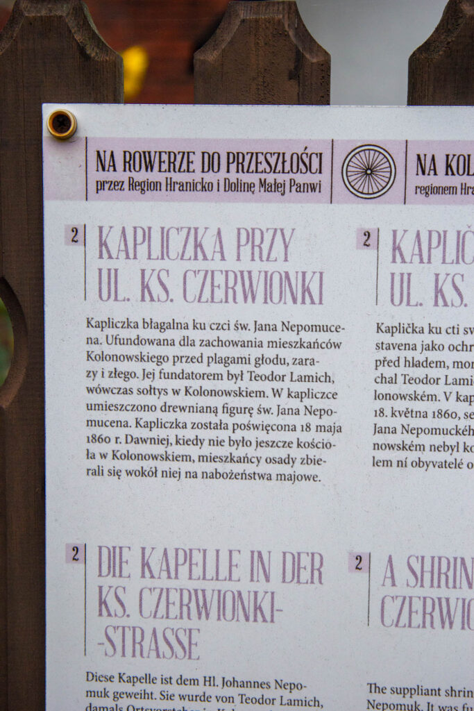 Kapliczka poświęcona Janowi Nepomucenowi. Ufundowana przez Teodora Lamicha. Poświęcona 18 maja 1860 roku.